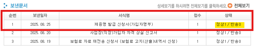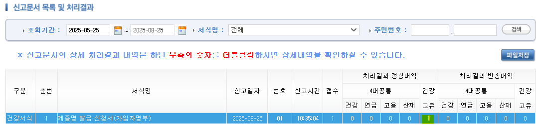 신고문서 목록 및 처리결과에서 건강 고유 정상내역에 1처리가 되어있는것을 확인할 수 있습니다.