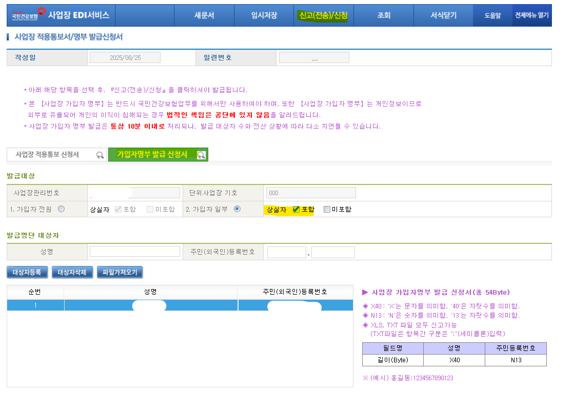 직원 개인의 입사일/퇴사일을 조회할 거라서 [가입자 명부 발급 신청서]를 눌러주고 상실자 포함에 체크해줍니다.