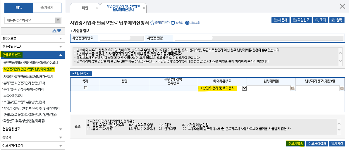 예외사유부호로 01. 산전후 휴가 및 육아휴직을 선택하시고, 납부예외일(출산휴가 신고일)과 납부재개신고 예정일(복직일. 즉, 출산휴가가 끝난 날의 다음날)을 입력해주신 다음, 신고서 발송을 눌러주시면 신고됩니다.