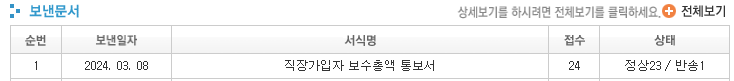 건강보험 EDI 메인화면에서 보낸문서함을 보면 직장가입자 보수총액 통보서가 접수된 것을 확인하실 수 있습니다. 처리가 완료되면 상태가 정상으로 반영됩니다. 반송인 경우는 일반적으로 보수총액신고기간(3월 10일) 전에 이미 퇴사한 사람을 신고했을 때 반송됩니다. 보낸문서함 [+전체보기]를 눌러서 결과를 확인하실 수 있습니다.