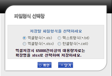 4) 파일형식 선택창이 나오면 [엑셀형식(*.xls)] 을 선택한 후 확인을 누릅니다.