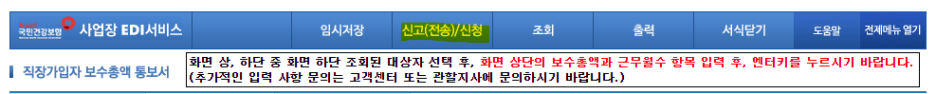 [공동인증서 로그인>신고/신청>직장가입자 보수총액통보서] 메뉴에서 보수총액 신고서를 접수하실 수 있습니다.